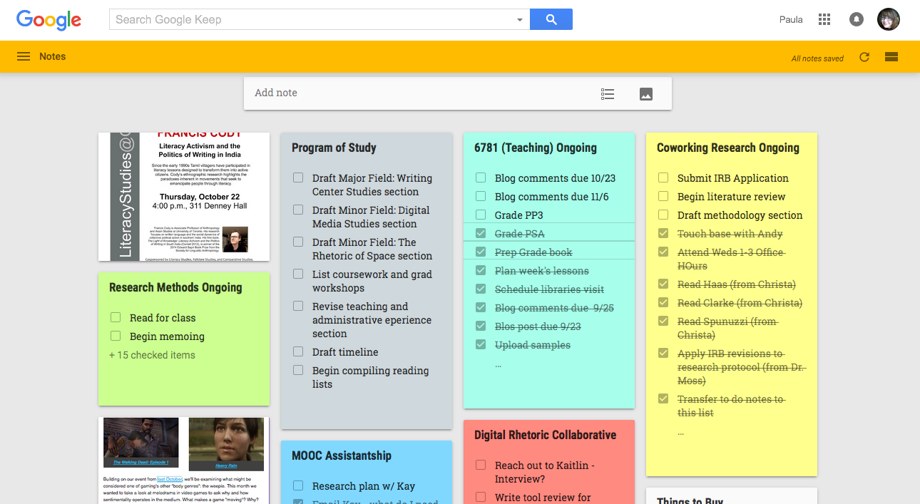 I am a sucker for sticky notes. When I was preparing for a cross-country move almost two years ago, I put together a four week plan for packing and cleaning the house using sticky notes on the dining room wall as a collaborative to-do list. I’ve always loved using sticky notes in my agenda for their flexibility and just for the sheer satisfaction of color coding my life, giving at least a decent illusion of control. Recently, I stumbled upon a lesser-known Google app – a sticky note program that functions as a collaborative, cloud based organizational tool.