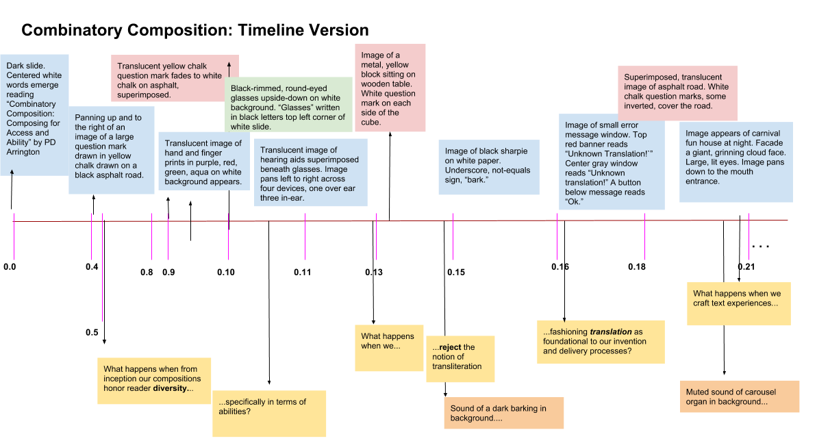 These offer linguistic translations of just the images of the video; essentially they are transcripts of the imagistic video with time stamps. Unlike screen reading the timeline, this version reads without the “jumble” of layered image descriptions. Composing for those who cannot see has been the most challenging, and in some ways most rewarding, experience. Combining a screen read of the linguistic text with the audio “Visual Descriptions” version below offers readers more information and meaning than the single version alone.