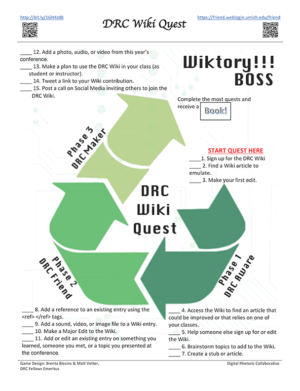 - Stop by our table in the Action Hub to pick up a DRC Wiki Quest game sheet. This handout provides instructions for registering and contributing to the DRC Wiki and helps you keep track of your edits and other “quests.” For every numbered task completed (e.g. “Make your first edit”), you’ll check off that item on the game sheet.
