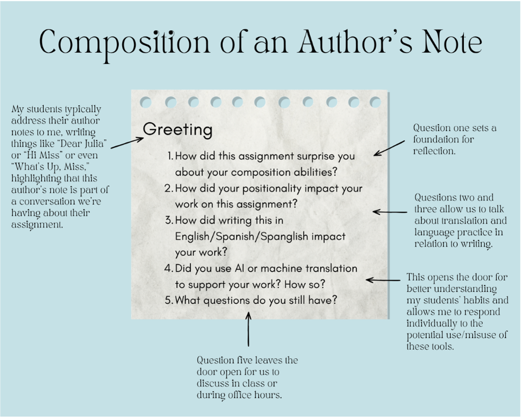 UTEP’s First-Year Composition Handbook emphasizes understanding our linguistic identities/histories to strengthen our writing (Rosenberg 2025), which guided how I developed new assignments and tweaked existing ones to model Gonzales’s multimodal approach to translation, even if my students were writing only in English, and to honor the importance of writing in one’s own voice. Furthering multimodality, I’ve also incorporated author notes for students to reflect on their composition processes, giving them space to talk about translation and meaning after completing each assignment. Through strategic questions, exemplified below, the notes encourage communication over perfection, working to dismantle the idea that machine translation knows best.