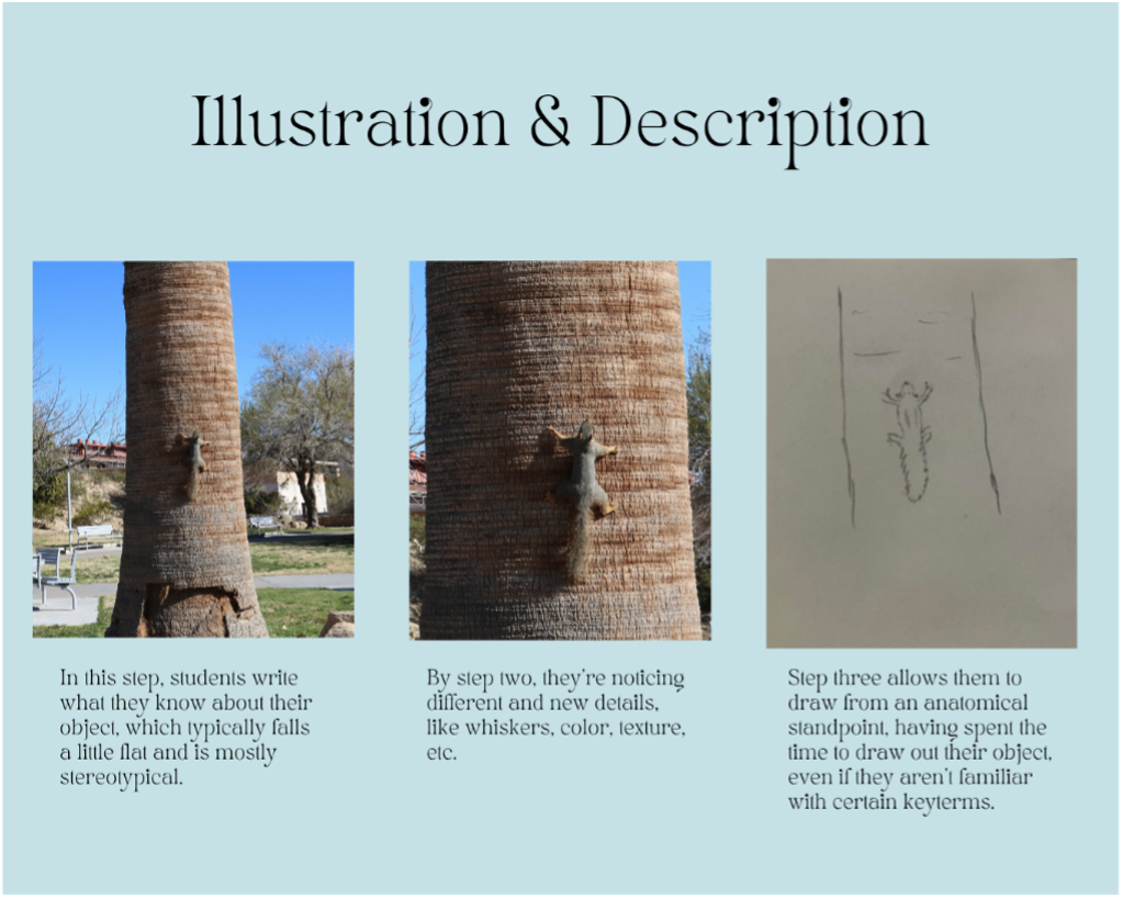 Because illustration is an often-important component of translation (Gonzales and Turner 2020), the second assignment, from our textbook Habits of the Creative Mind, utilizes drawing as a way of seeing, interrogating, and reflecting. In this assignment, students find an organic object (plants, animals, rocks) and go through three rounds of description, which ends with illustrating the object. While I don’t evaluate the quality of the illustration, the goal is to slow down, analyze details they may have missed, and engage with how words and pictures connect – much like how one may sketch during the translation process to fill gaps in vocabulary. In their reflections, students have remarked how pushing themselves to more strongly describe their object has enriched their vocabulary and descriptive writing, making for good practice switching between English and Spanish writing.
