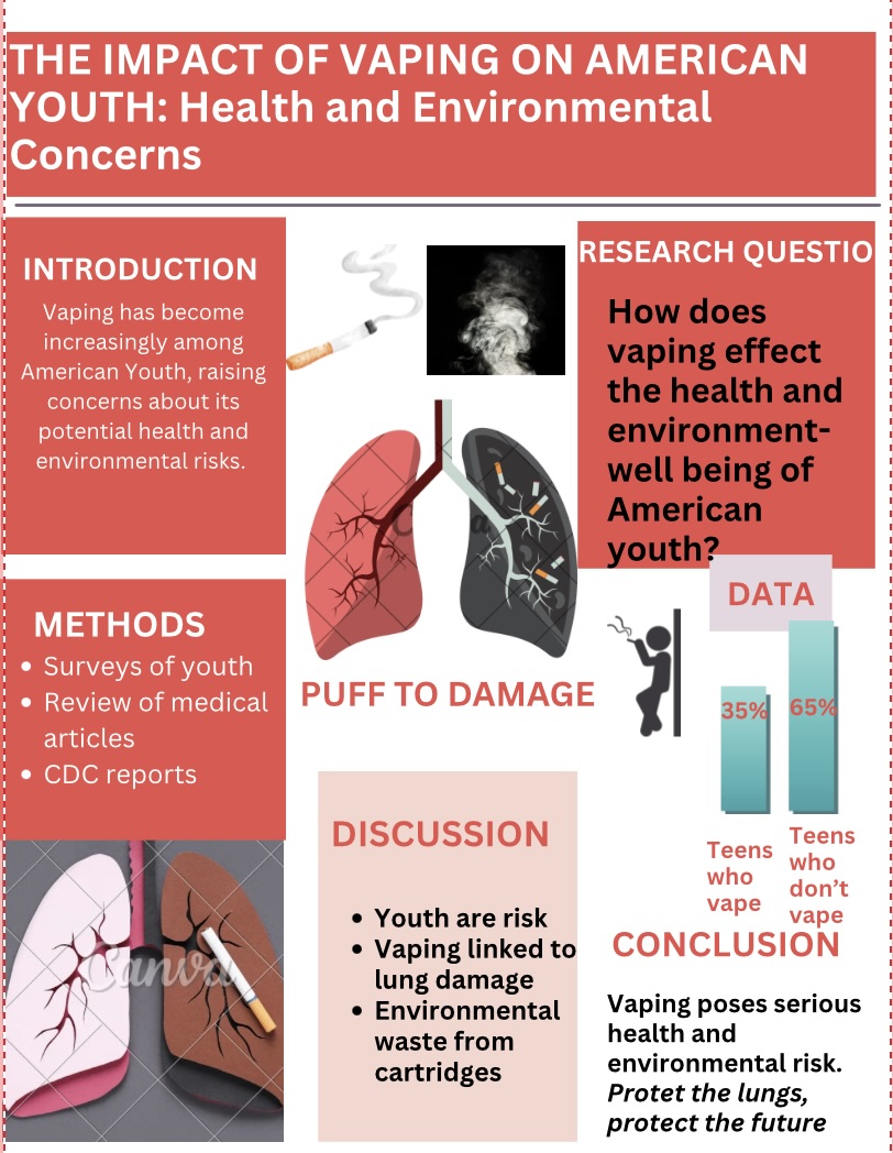 One student whom I call Chen created a research poster titled: “The Impact of Vaping on American Youth: Health and Environmental Concerns.” What makes Chen’s work powerful is how she crosses semiotic borders to make her augments. In her reflection, she explained that she wants her poster to communicate to the American youth the dangers of vaping clearly to her audience. One way she did this was through color. She said she used a red and white background to communicate the dangers and health risks of vaping. Her explanation suggests color choices are a rhetorical move. This also aligns with Kress and van Leeuwen’s point that visual elements like color can carry social meaning and help how viewers interpret a message.